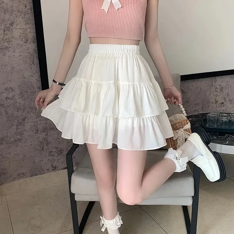 Pleated A-line Skirt White Women Ruffles Sweet Hottie Preppy Style Elastic Elastic Waist Slim Thin SimpleCasual Summer Wholesale